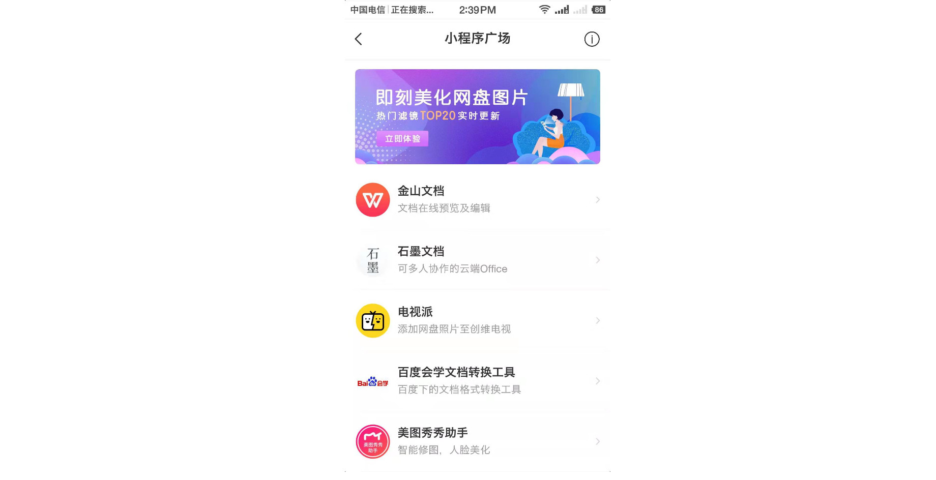 例如,百度网盘小程序就简化了应用APP上的功能,并主打推出好友共享文件这一功能,用来刺激自身产品的使用。