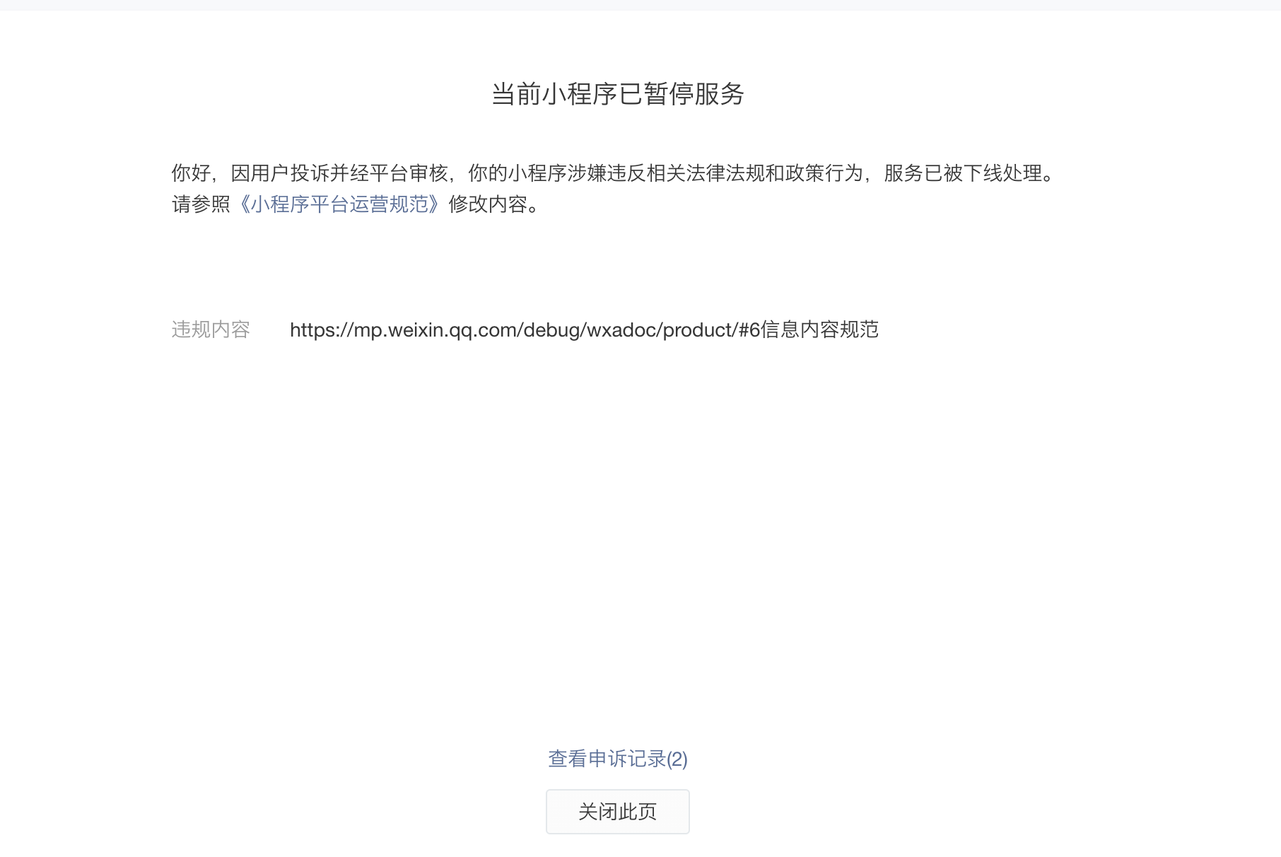 小程序被提示:涉嫌违反相关法律法规和政策,无站内封禁信、无法提交申诉?怎么解决?