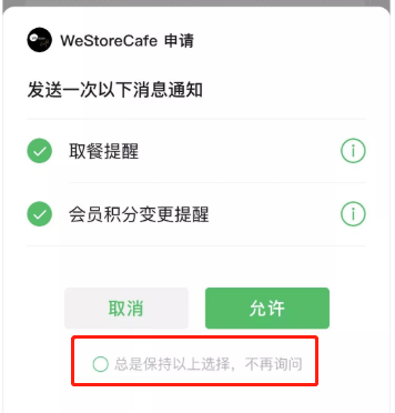 调用wx.requestSubscribeMessage向用户要求发一次性订阅消息权限的时候,如果选择确定的同时还选择了总是保持以上选择,wx.requestSubscribeMessage的订阅弹框就不再出现。
