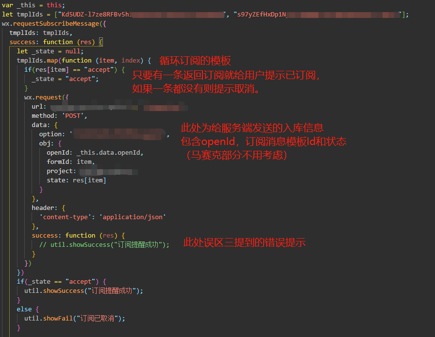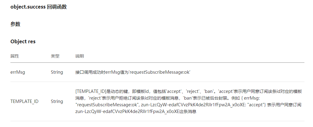 我们通过 wx.requestSubscribeMessage 接口发送的时候是知道需要让用户订阅哪几个模板的,就是 tmplIds 这个参数填的数组。那么根据官方文档的回调内容,我们就可以直接在success内去获取对应的key所返回的状态。把获取到的状态分别存入自己的数据库里。发送的时候去数据库里查询需要发送的模板并且状态为accept的去发送,如果发送成功则删除一条记录(因为没有过期一说,所以随便删除哪一条记录都不影响)。