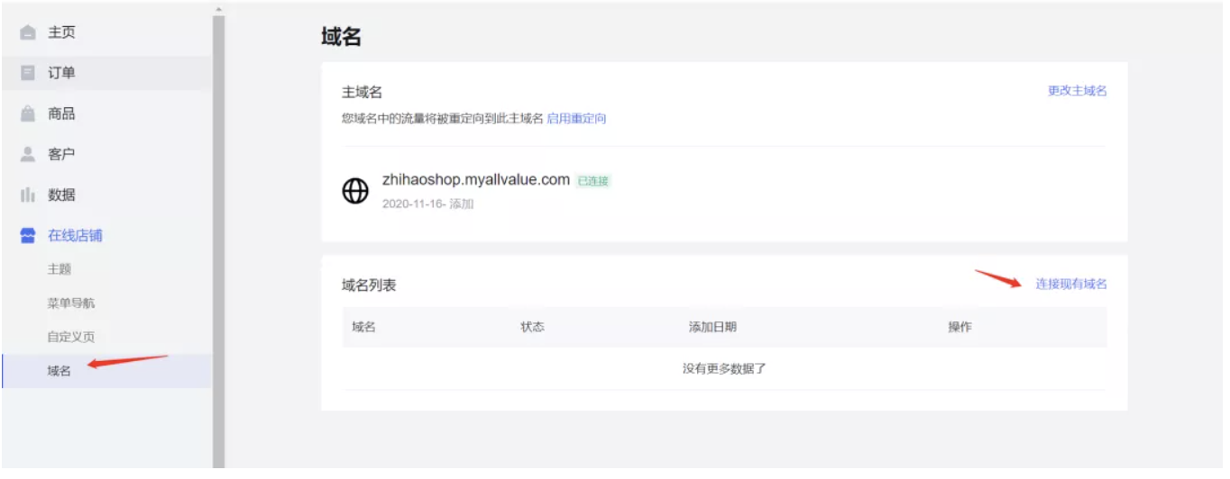 在左边的目录中点击「在线店铺」>「域名」首先可以看到店铺的免费网址,这是AllValue 在注册账号完毕后自动生成的,如果你目前没有域名,亦可使用该网址进行推广你的店铺。如果你已有域名,可点击「连接现有域名」进行绑定域名。