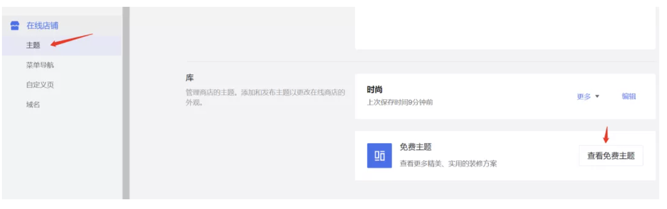 在左边的目录中点击「在线店铺」>「主题」>「查看免费主题」 ,我们目前提供多种品类和行业的主图,选择一个商店风格后,点图片下面的「添加到主题库」即可