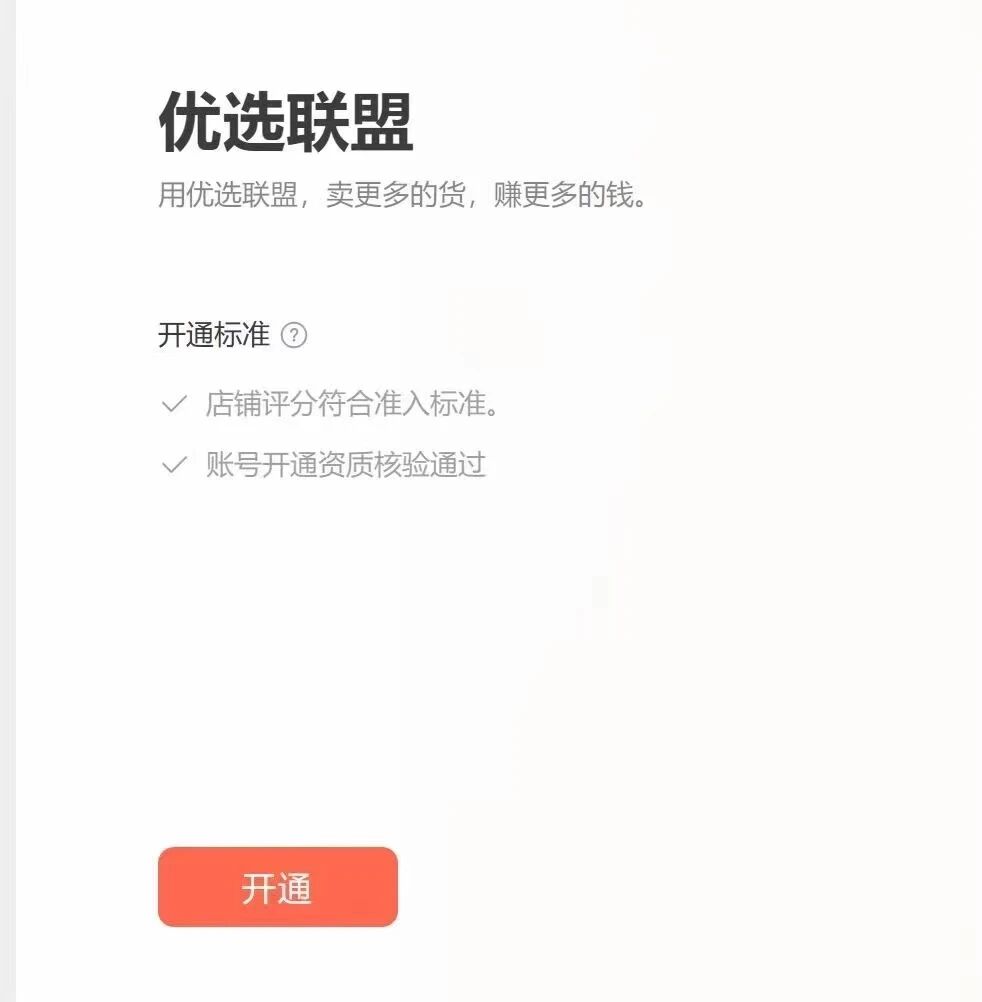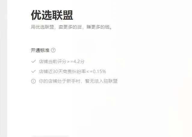 新手期要求比较特别:很多商家不知道什么标准,无法去开通新手村操作。新手期到底怎么去过呢?很多商家未来开通优选联盟分享功能。店铺新手村:平台将针对新入驻商家进行新手村管理,在村期间商家无法入驻联盟。商家的订单数、好评率、纠纷率等指标通过考核后即可出村,这个是出新手村的重点内容。店铺评分 过往好评率是不是达到行业水平。纠纷率不能高,我们碰到很多店铺有这个问题,一不小心店铺差评 商家纠纷责任高了,这个是最容易出现的问题,即使开通啦,这个数据保持不好也容易被清退。不过也不用过于担心,即使被清退了也可以重新开通怎么确定自己的店铺有没有过新手期呢,看下面截图 如果出现可以点开通的页面就已经过了新手村啦。