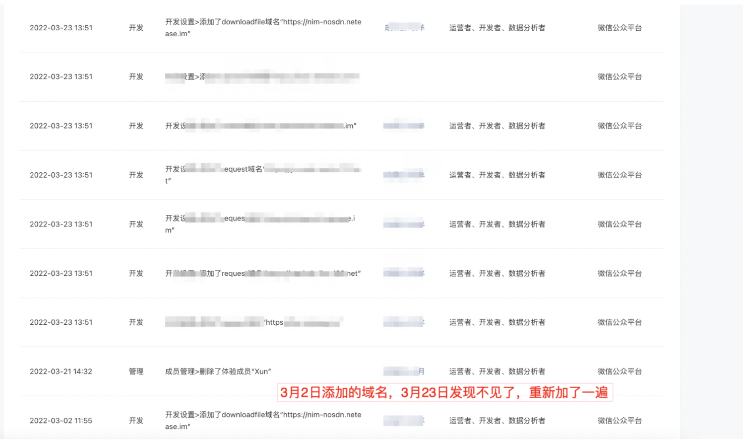 2022月3月2日提审的版本,项目接入 IM 功能后配置了 request、socket、upload、download 域名,但是今天早上这些域名全部被清空了?导致功能不可用。除了管理员账号登录管理平台修改,还有别的手段吗?