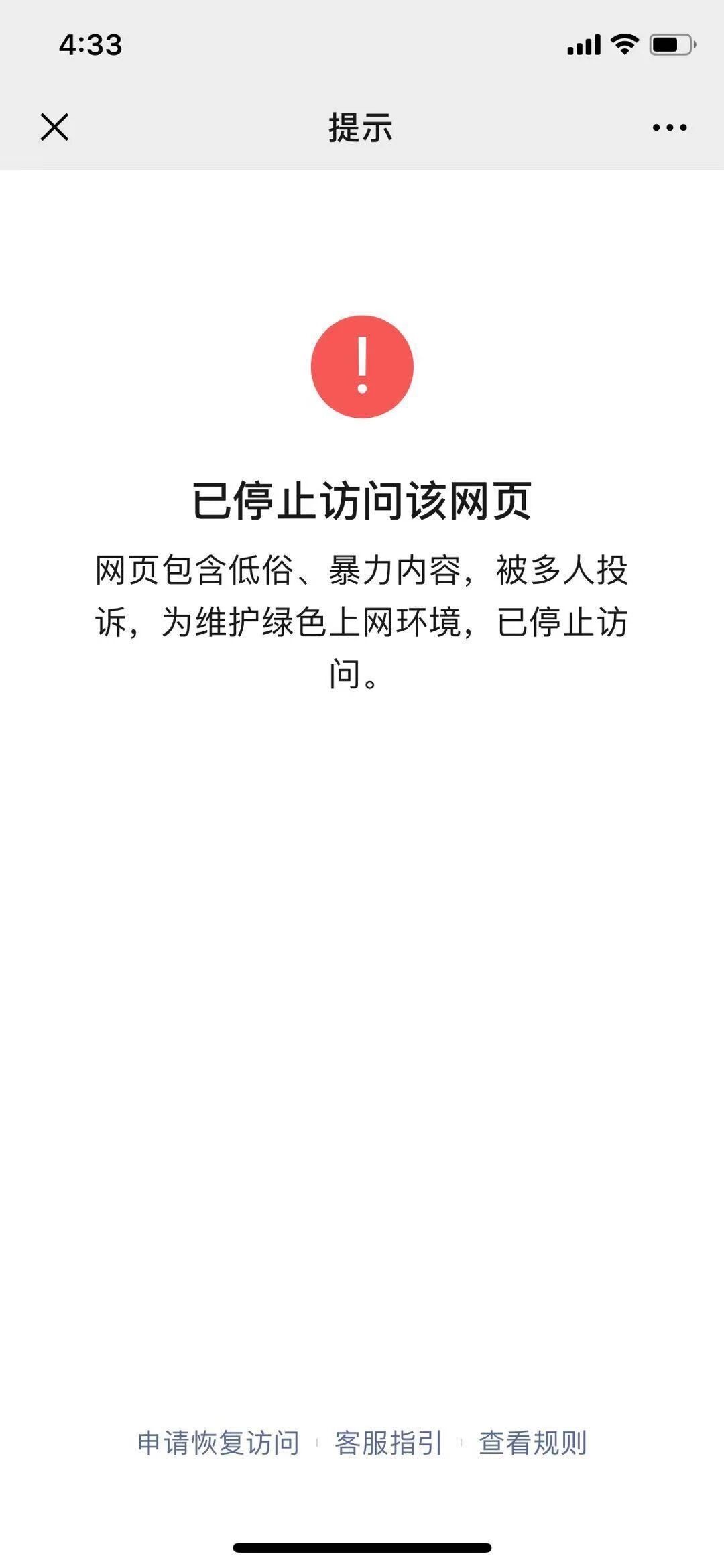 有官方人员在吗?我这边是一个新站刚上线,都还没有开始推广,访问统计也只有内部测试访问记录。在微信访问下就被提示多人投诉。问题是内容也没有涉及到低俗、暴力内容。烦请予以核查和解除封禁,O(∩_∩)O谢谢。