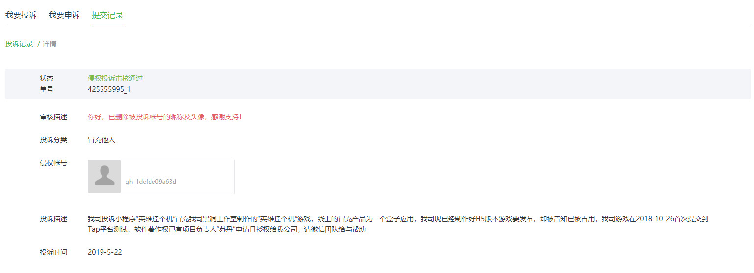 我们团队制作的一个App版游戏被一个个人开发者申请盗用了小游戏应用名称。