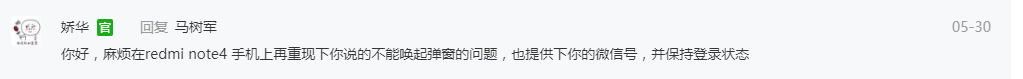 你好,麻烦在redmi note4 手机上再重现下你说的不能唤起弹窗的问题,也提供下你的微信号,并保持登录状态