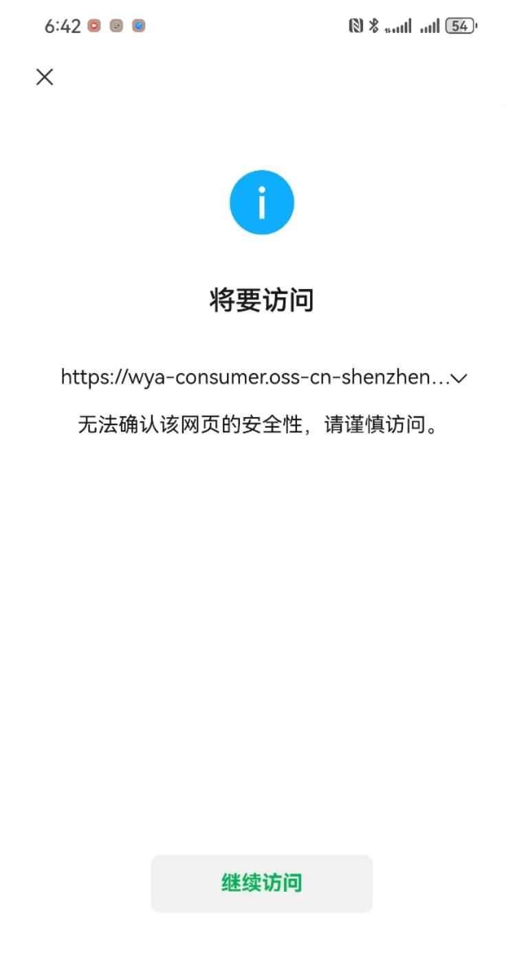 微信内长按识别通过普通链接生成的二维码后,无法跳转小程序,而是打开以下页面,点击“继续访问”后,则直接报错。但是若通过微信后置的摄像头扫描二维码,则可以直接进入小程序。