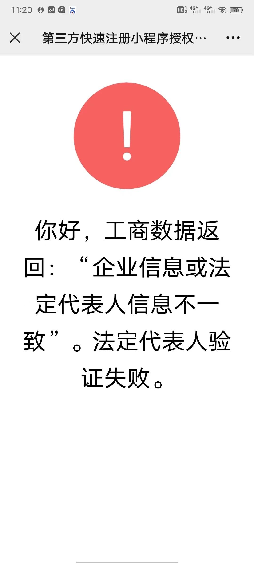 工商数据返回:企业信息或法定代表人信息不一致,微信是本人信息,实名认证,营业执照也是2020年成立,开始个人信息没有完善,现在完善了,还不是不能重新授权,点击详情,还是进入第二画面请问怎么回事?