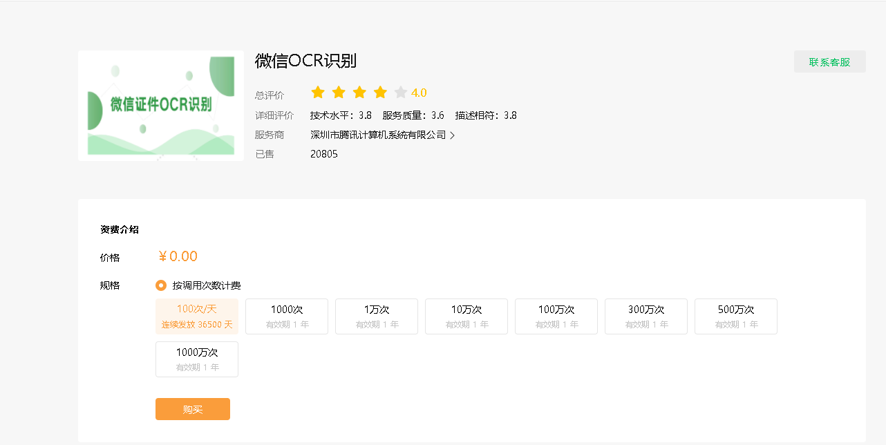 微信 OCR 能力已全面接入服务平台计费系统。除服务平台接入方式外,原内测API,插件接入方式也均已接入计费系统。2020.4.1起,已接入内测的开发者,免费额度会统一调整为100次/天,更多额度需付费购买资源包,账号内资源包额度为所有调用方式可共用