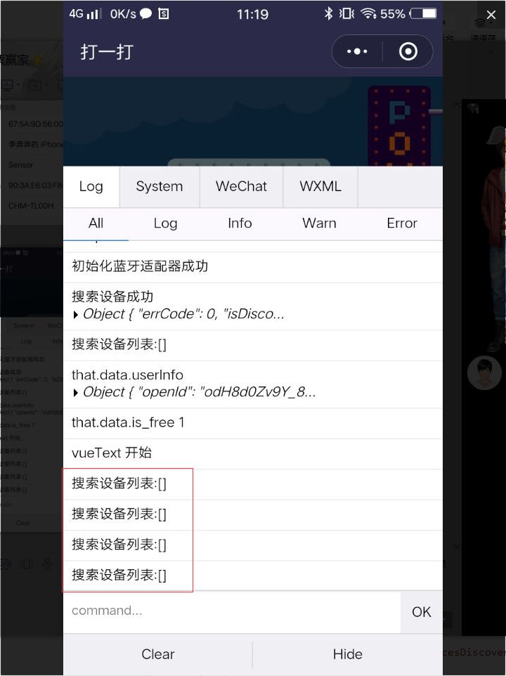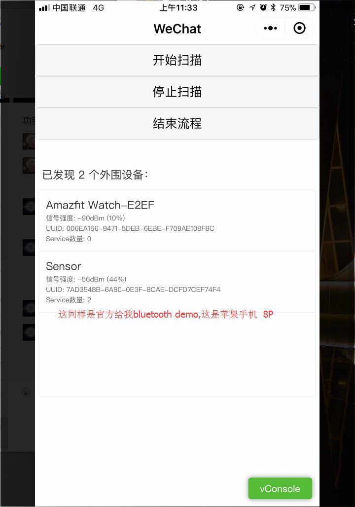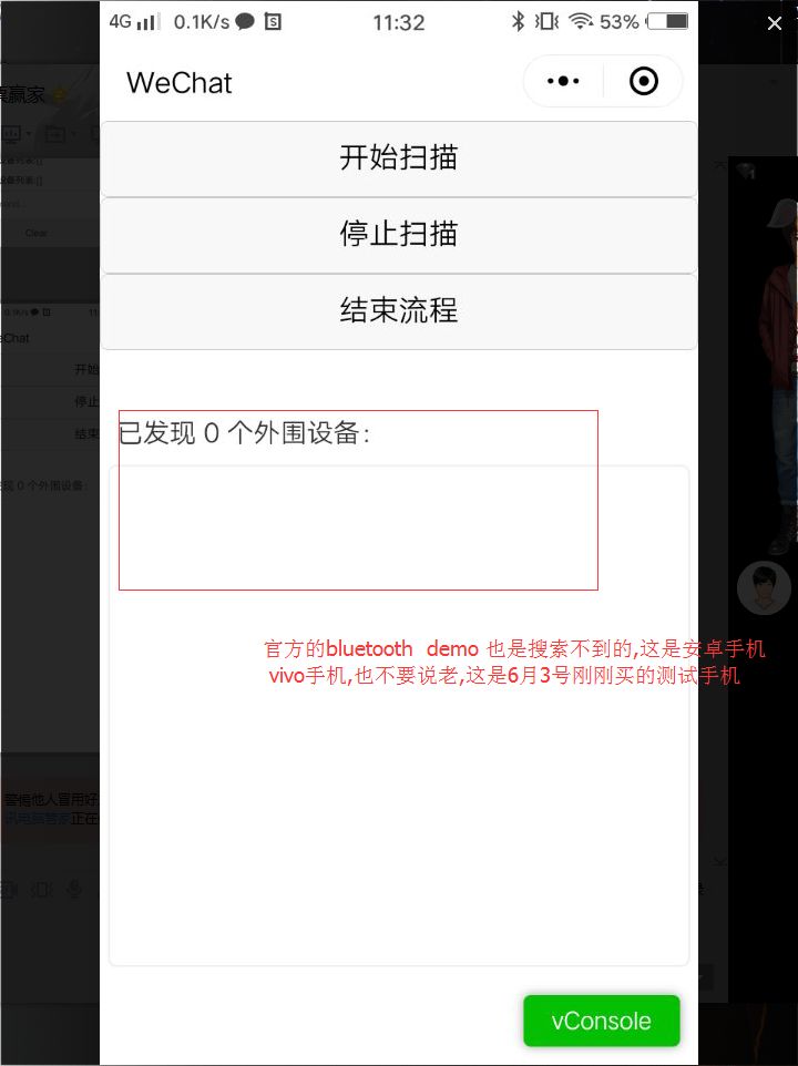 相同的代码,不同的手机wx.startBluetoothDevicesDiscovery搜索出来的设备不同,安卓手机搜索不到蓝牙设备,一个也搜索不到,但是在手机自带的蓝牙页面里面就等搜索到!!!!!!!苹果手机是没有搜索到的!!!图一是安卓手机vivo搜索到的