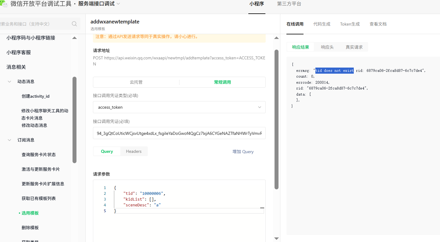 订阅消息--开发者通过服务端接口 addMessageTemplate 添加模版,返回tid不存在?什么原因?