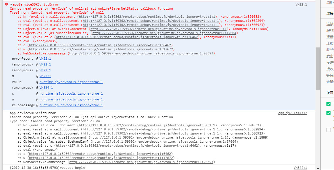 以上是精简的代码片段,经过测试,真机调试中只要live-player绑定了onNetstaus函数,在播放状态等待3-5分钟就会报错,不管是否调用,
