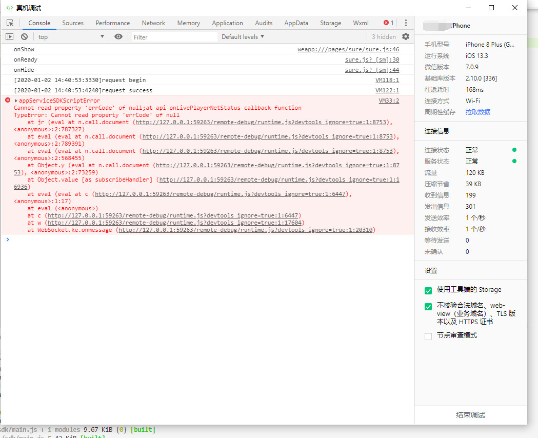 机型是iphone8plus,微信是7.0.9,小程序SDK是2.9.4,系统是ios13.3但是这个复现的代码片段给不了你啊,再说,这是在开发过程中,还有一大堆代码没写呢,我也不知道因为啥出的这个错误,话说上传手机的日志你们能看见吗?