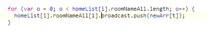 for (var o = 0; o < homeList[i].roomNameAll.length; o++) { homeList[i].roomNameAll[1].broadcast.push(newArr[t]); }