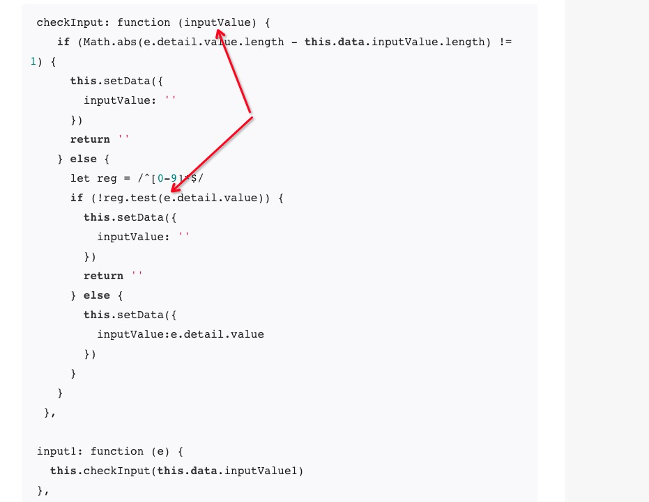 if (Math.abs(inputValue.length - this.data.inputValue.length) != 1) { this.setData({ inputValue: '' }) }关于写法: