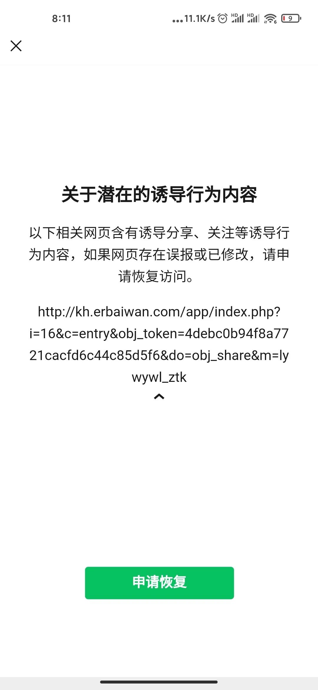 你好,已备案域名,创建的活动链接被误拦截 根域名和二级域名都是正常的,但是在创建的微信活动链接被拦截了,目前已经整改删除活动,请求恢复拦截 链接: http://kh.erbaiwan.com/app/index.php?i=16&c=entry&obj_token=4debc0b94f8a7721cacfd6c44c85d5f6&do=obj_share&m=lywywl_ztk