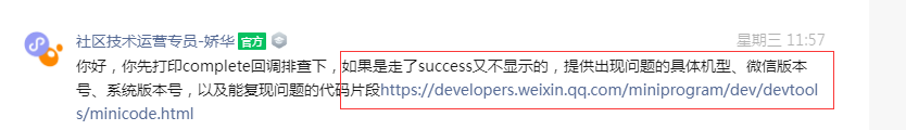 你好,你先打印complete回调排查下,如果是走了success又不显示的,提供出现问题的具体机型、微信版本号、系统版本号,以及能复现问题的代码片段https://developers.weixin.qq.com/miniprogram/dev/devtools/minicode.html