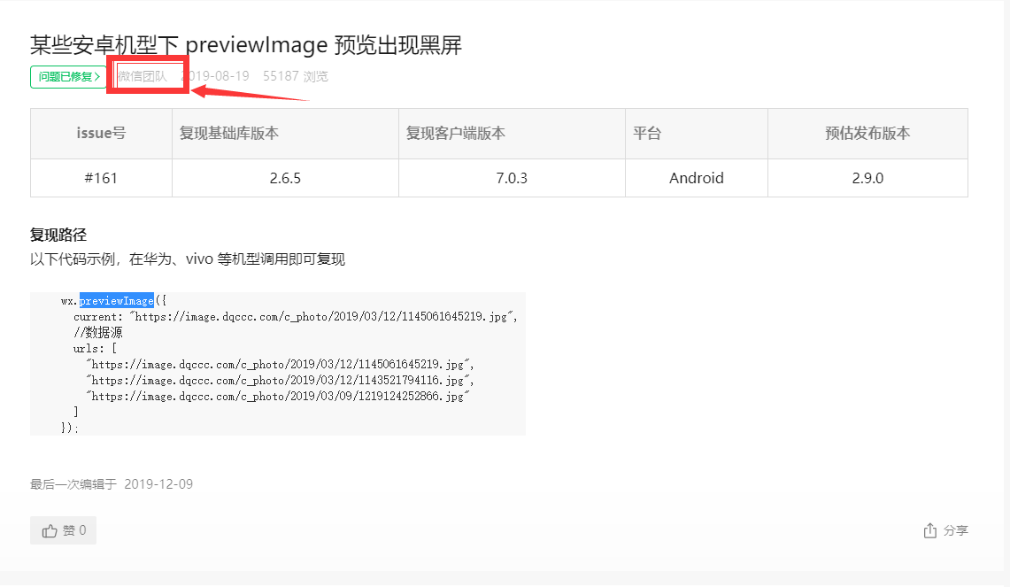 以上是代码,图片地址https://res.chinascj.com/pic/exhibition/200103134751118898.jpg;大概8M左右,ios手机,秒开且清晰,安卓手机,4G网永远在转圈圈,我看社区,微信团队显示已经修复?我试过的安卓机子大部分打不开,特别是华为的机型,根本不行。因为看到有人说http的图片打得开,https的打不开,尝试着替换http的,图片一样加载不出来,实在是没办法了,查了好久,也没有一个可以解决的方法。