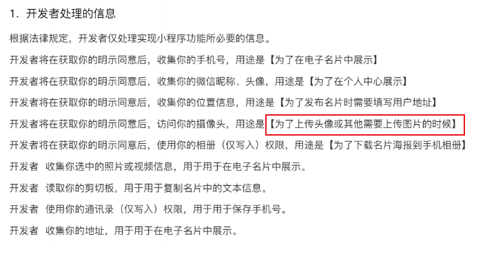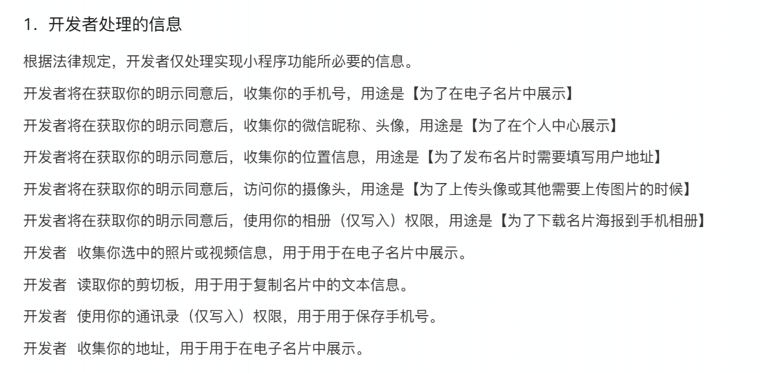 我需要上线一款电子名片小程序,因为需要使用到摄像头、昵称、电话等接口,我完全参照另一个已上线的同款小程序隐私保护进行设置提交,已经4次驳回,但不告知具体什么问题,该如何填写。我提交的内容截图如下: