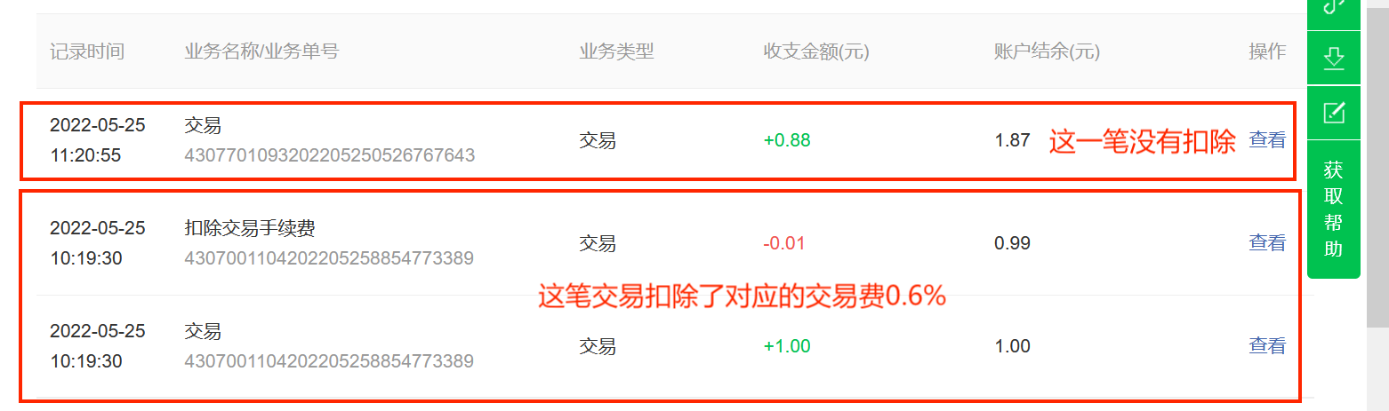 有两笔交易,第一笔扣除了交易费0.6%;第二笔没有扣除,这是什么原因呢?