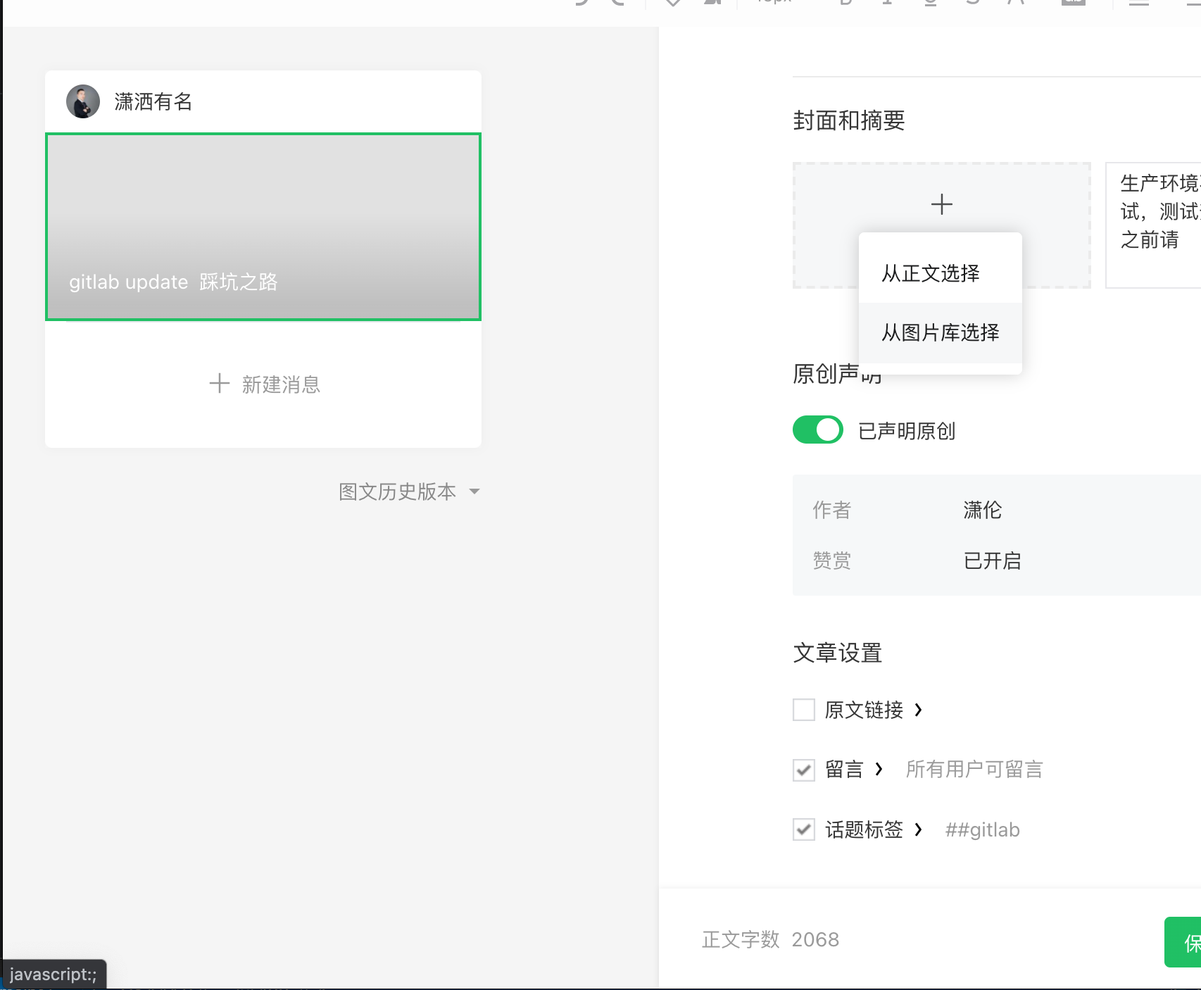 已经好几天,更换各种浏览器,更换几台电脑,选择封面图片始终没反应,根本无法发送公众号文章