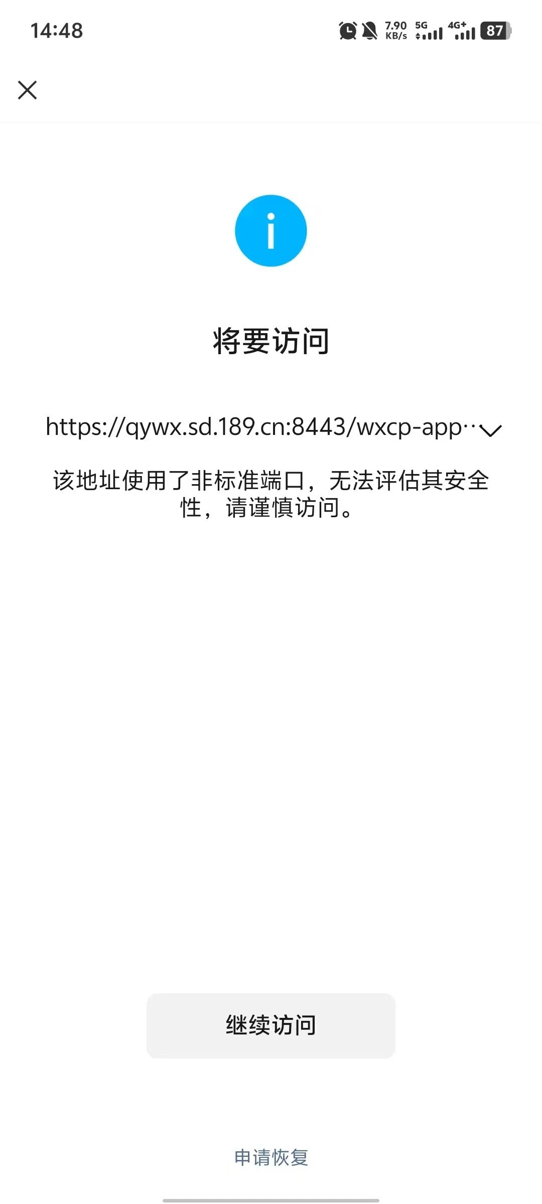 网站域名:qywx.sd.189.cn,端口8433,该网站用于我司企微自建应用,为员工维系客户关系提供服务。近期发现客户经微信内其他网站跳转至该域名时微信会提示“该地址使用了非标准端口,无法评估其安全性,请谨慎访问。”
