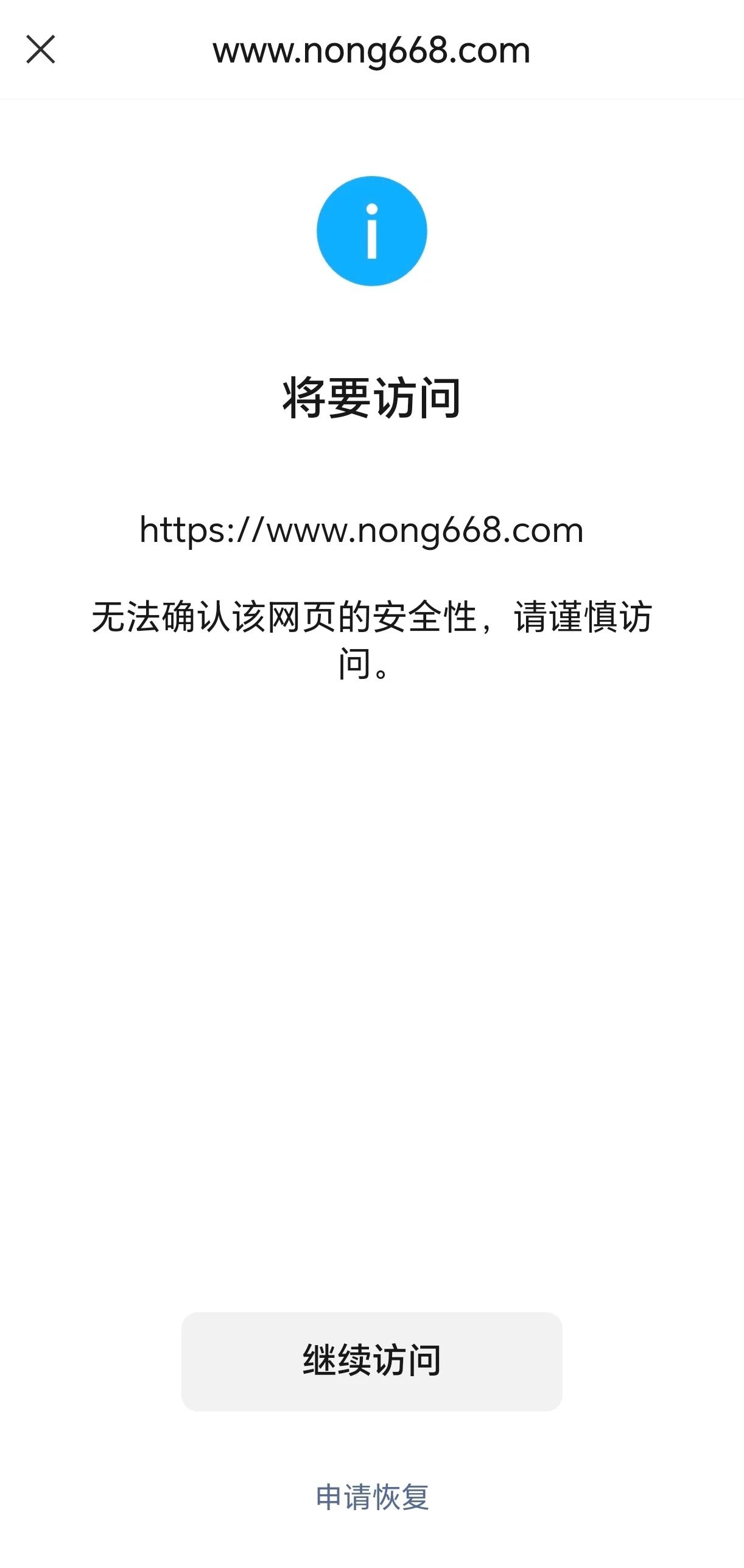 网站www.nong668.com访问受限,提示可能非安全网站,实际上是ICP认证及SSL证书最新配置有效,且无非法违规内容,应该是被竞争对手或恶意攻击,请确认恢复,谢谢!