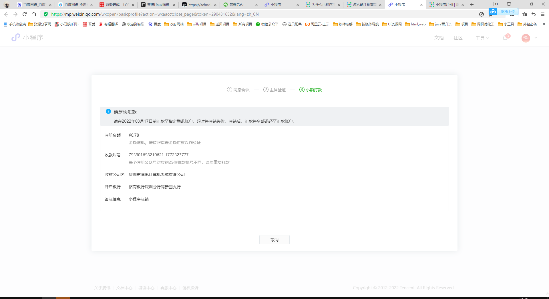 按照提示信息 使用认证公司主体的对公账户打款,如果无法进行打款验证。找腾讯工作人员