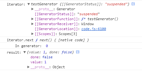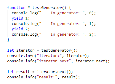 function* testGenerator() { console.log(" In generator: ", 0); yield 1; console.log(" In generator: ", 1); yield 2; console.log(" In generator: ", 2);}let iterator = testGenerator();console.info("iterator:", iterator);console.info("iterator.next", iterator.next);let result = iterator.next();console.info("result:", result); |