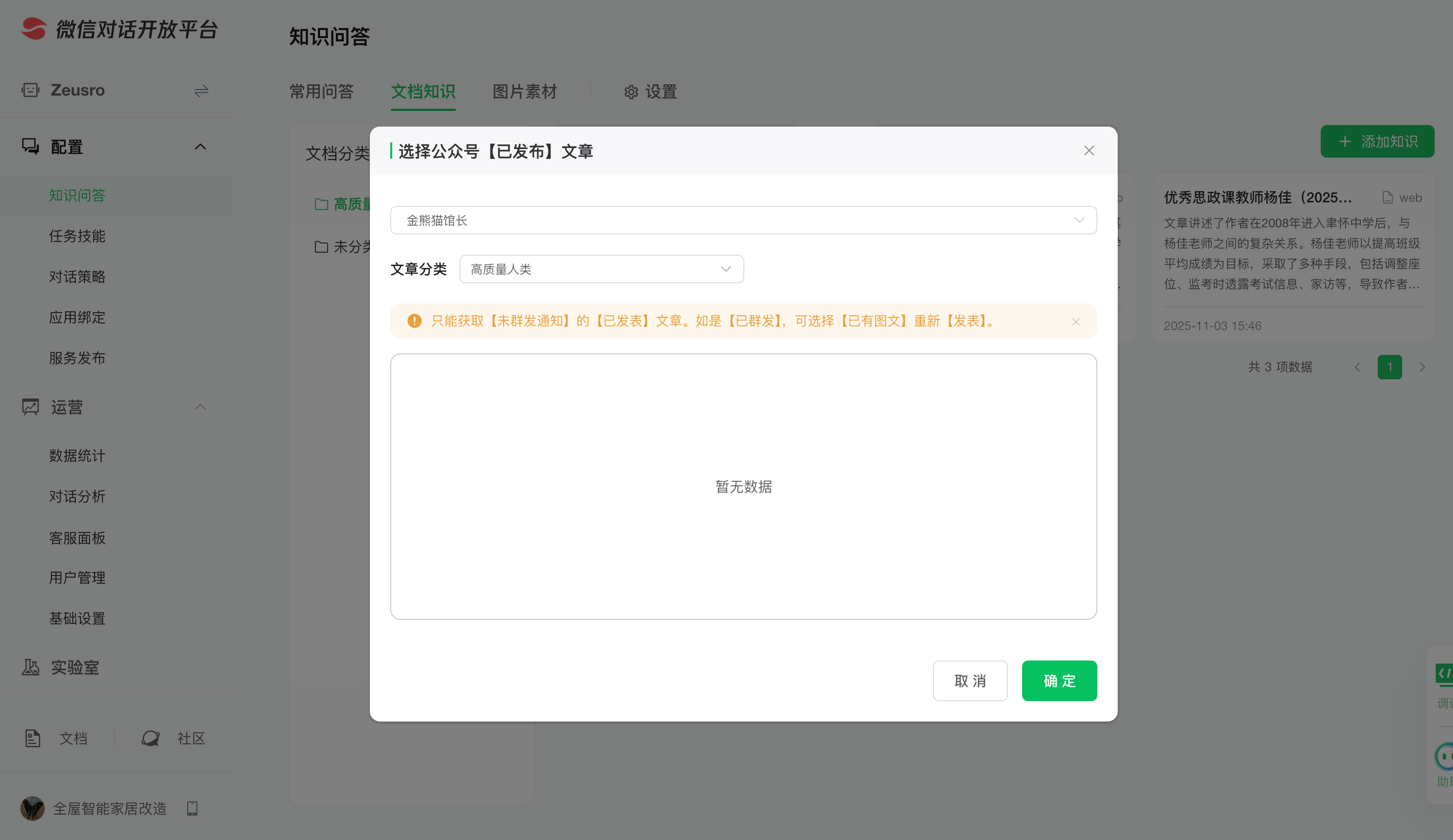 配置-知识问答-文档知识-选择公众号【已发布】文章