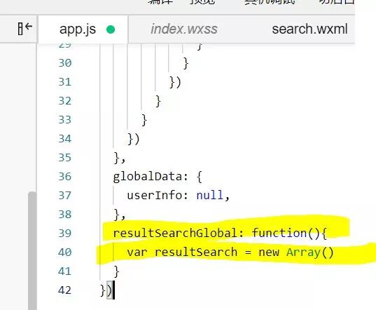 我编程比较小白,如图在app.js里定义了一个全局resultSearchGlobal的函数,但在index.js里面app.xx调用不到这个函数,而且app.globalData也无法调用。不知道哪里出错了