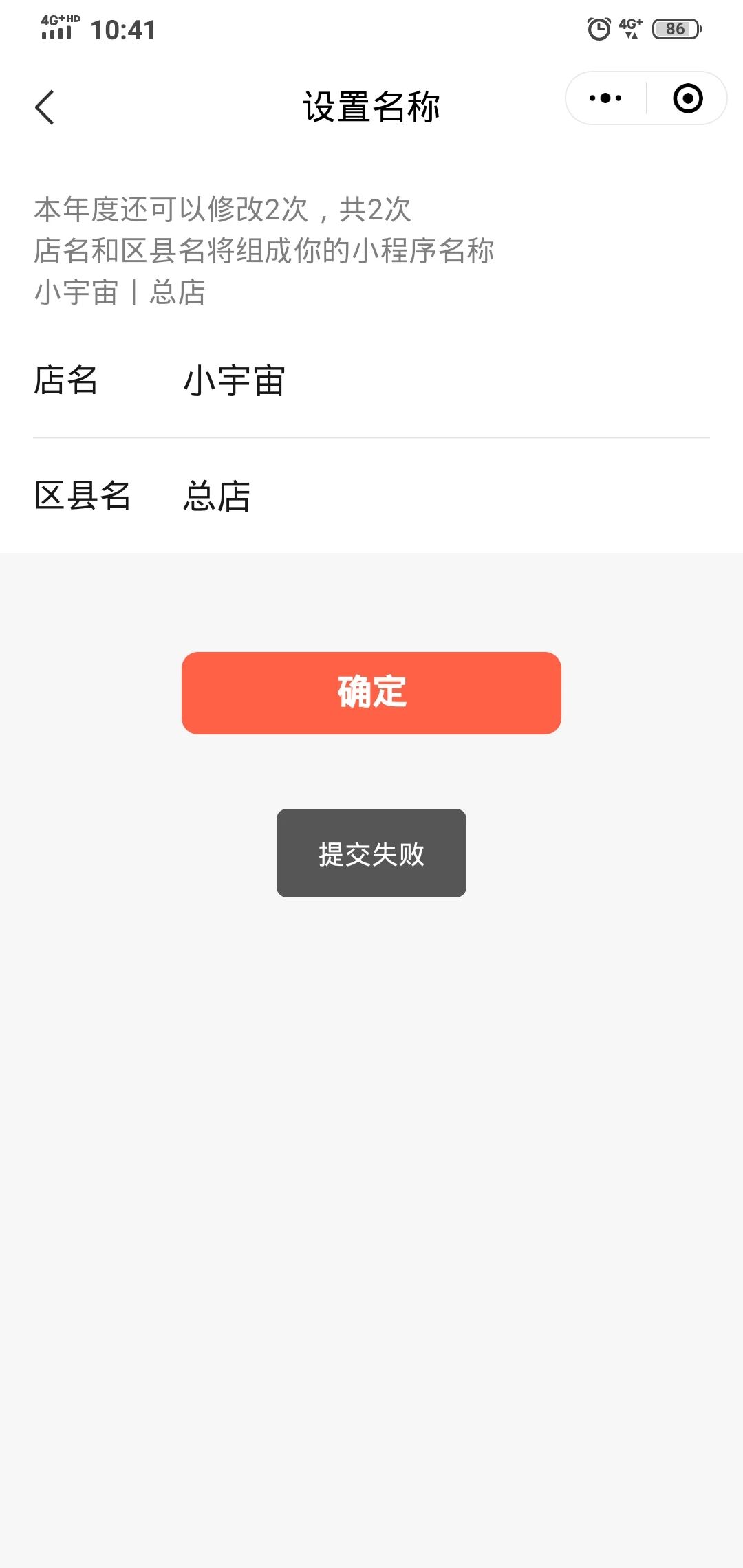我自从建了小程序,第一次设置名称以后,就没能成功修改过,每次都是提交失败,我写中文也是,英文也是,不知道怎么回事?