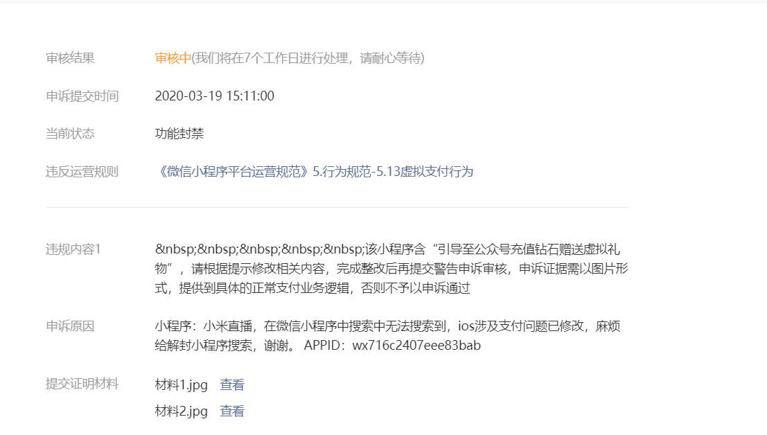 小程序IOS搜索被禁,提交了2周了一直没有审核,目前已经整改去除了IOS支付入口。APPID:wx716c2407eee83bab