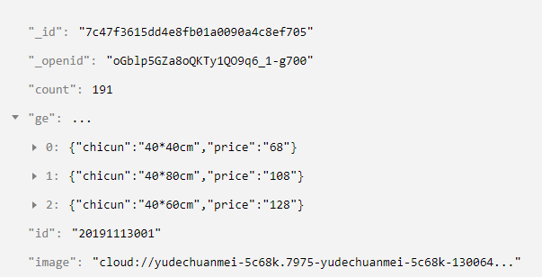 请问各位大佬云数据库的数据如图,“ge”是商品的规格,现在想获取所有的“chicun”并显示到页面,我应该怎么做?还有,不知道这个数组这样写对不对,如果不对,也请大佬们指教一下