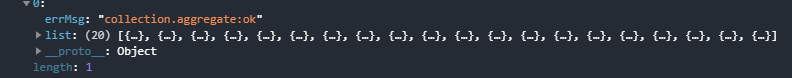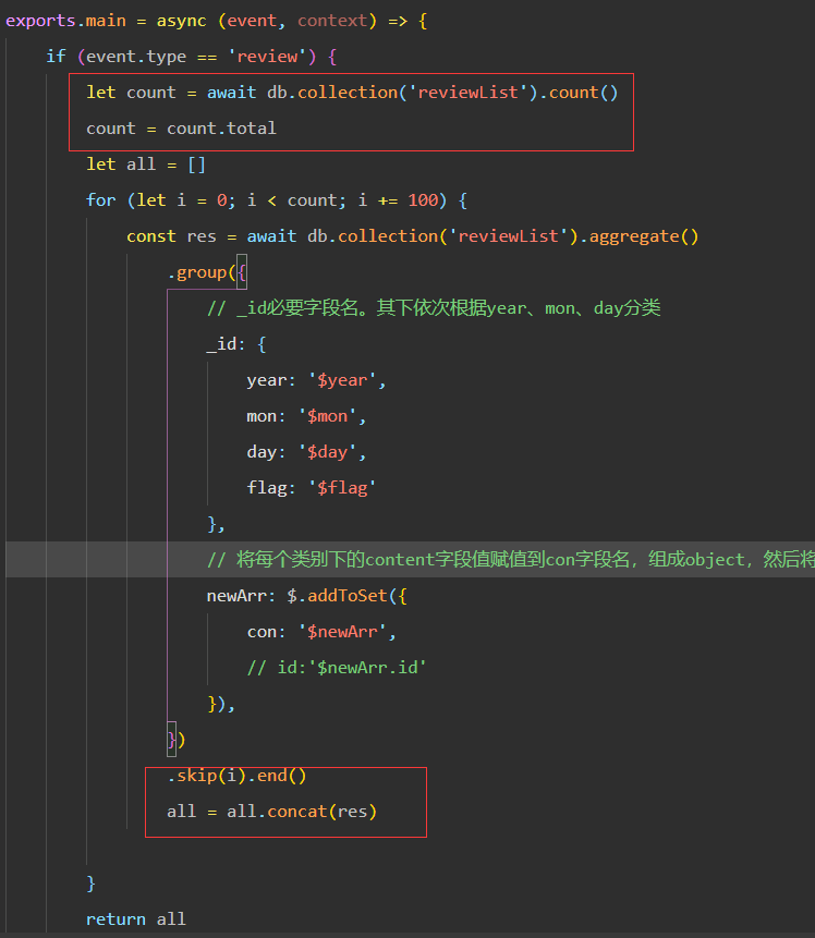 exports.main = async (event, context) => { if (event.type == 'review') { let count = await db.collection('reviewList').count() count = count.total let all = [] for (let i = 0; i < count; i += 100) { const res = await db.collection('reviewList').aggregate() .group({ // _id必要字段名。其下依次根据year、mon、day分类 _id: { year: '$year', mon: '$mon', day: '$day', flag: '$flag' }, // 将每个类别下的content字段值赋值到con字段名,组成object,然后将整个object放到li字段名上 newArr: $.addToSet({ con: '$newArr', // id:'$newArr.id' }), }) .skip(i).end() all = all.concat(res) } return all