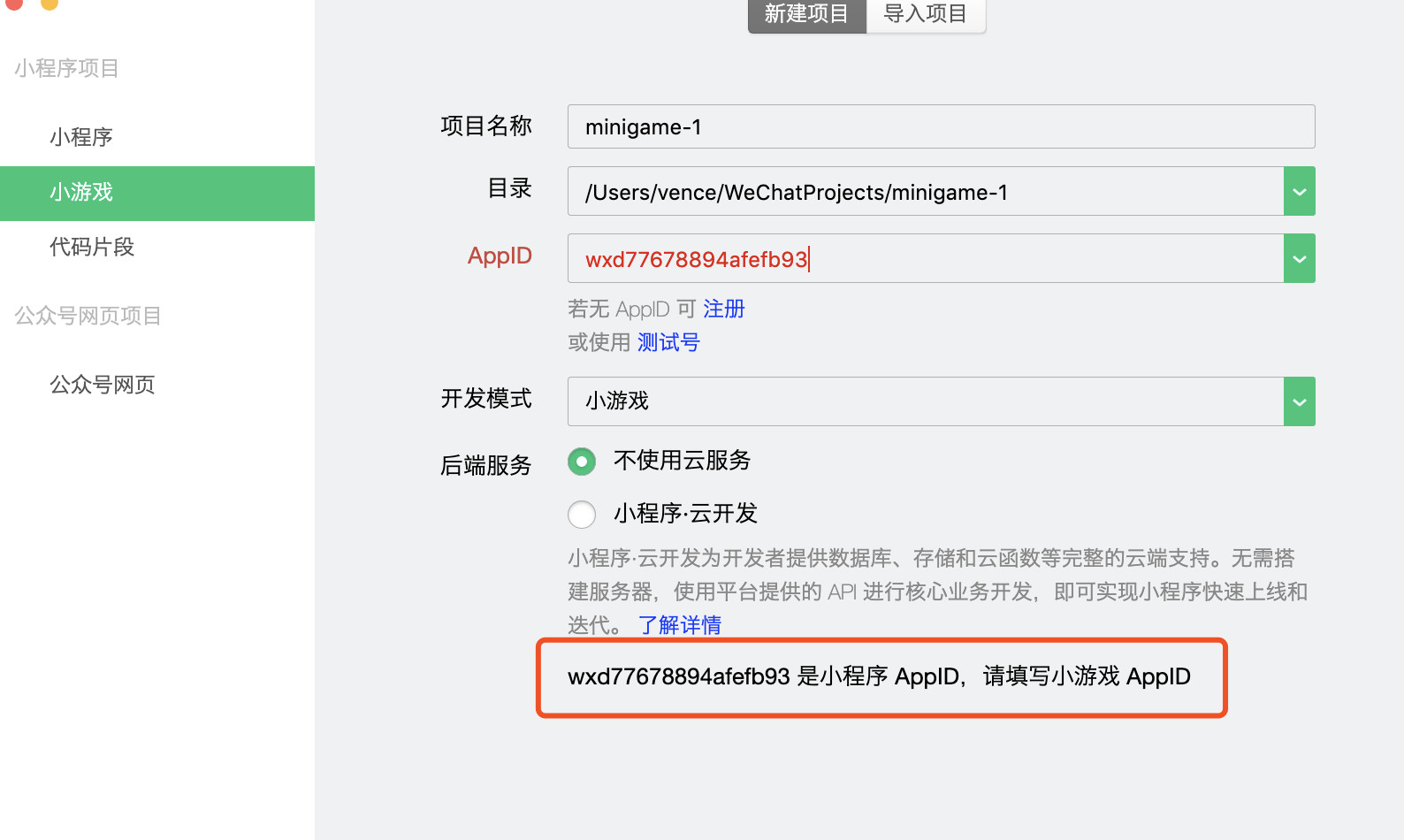 服务类目已经设置为小游戏:开发者工具上填写该APPID,提示是小程序AppID: