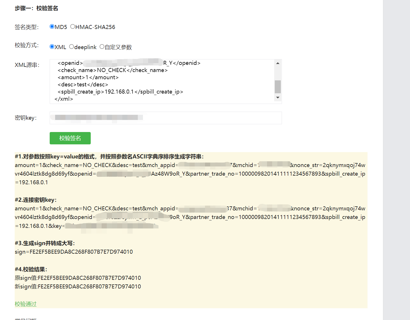 签名工具只校验签名的方式是否正确,不校验参数的正确性。要先检查key是否正确,然后比对文档检查参数是否有存在不合法的,最后确认请求参数与计算签名参数是否一致