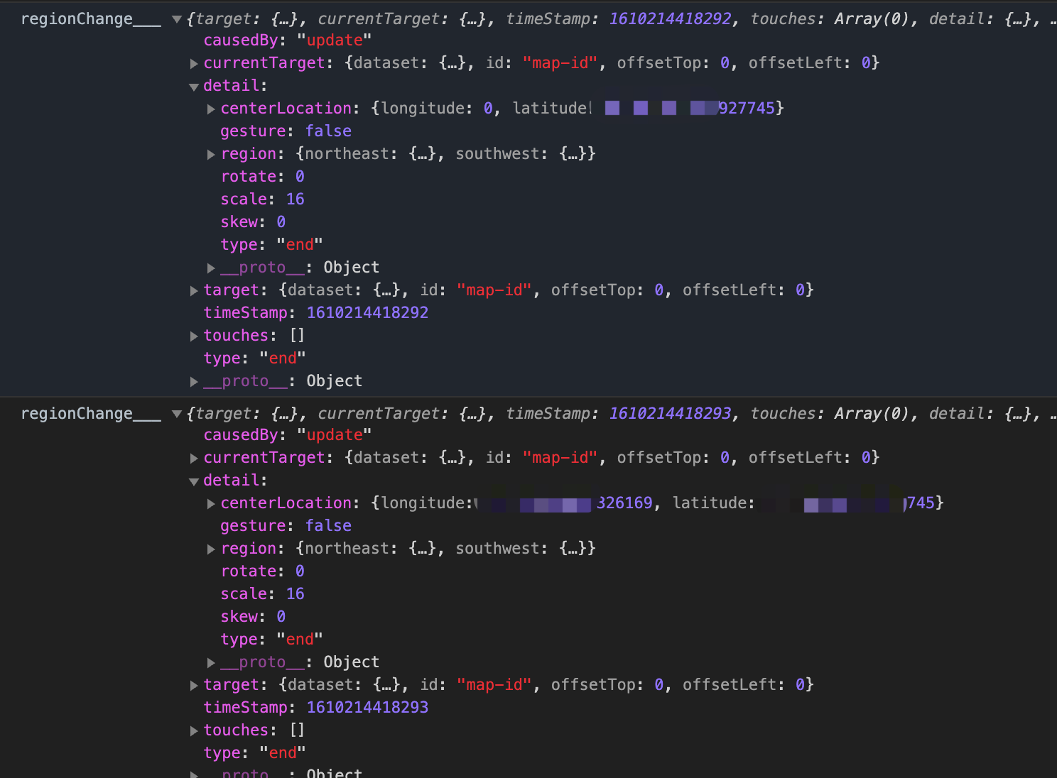 只好根据坐标来判断下是否执行。新坐标和旧坐标相同,就不执行regionchange事件。