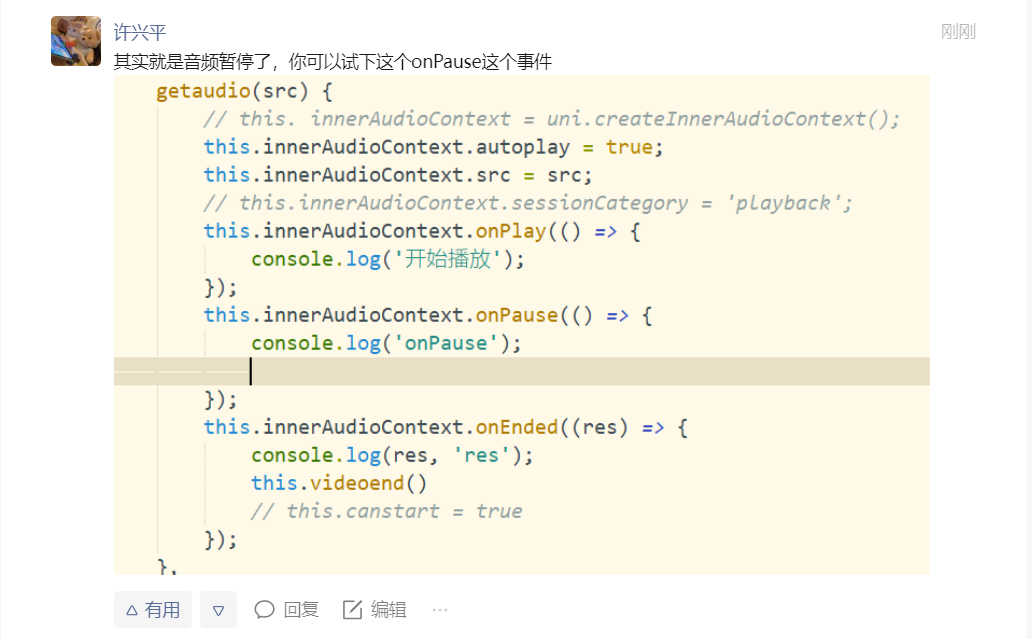 虽然在该情况下,可以onPause事件让音频继续播放,但这样会与普通的暂停逻辑混淆。