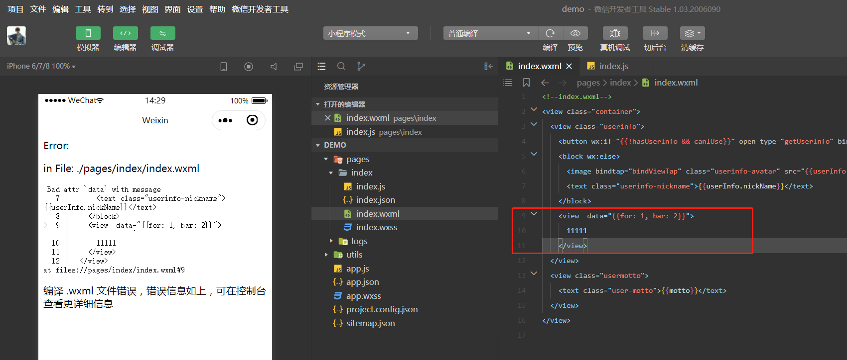 data="{{foo: 1, bar: 2}}" 这种只能用在template标签