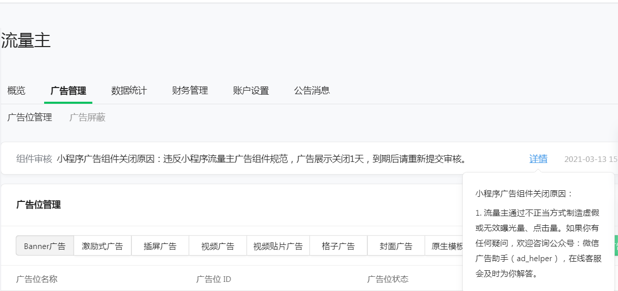 小程序广告组件关闭原因:违反小程序流量主广告组件规范,广告展示关闭1天,到期后请重新提交审核。