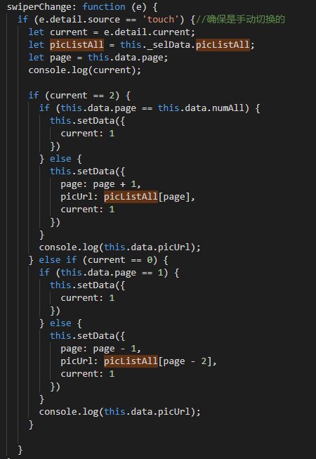 3. 切换的时候根据bindchange获取current属性,当current改变时判断当前图片在picListAll的index,根据index拿到图片再赋值给picUrl