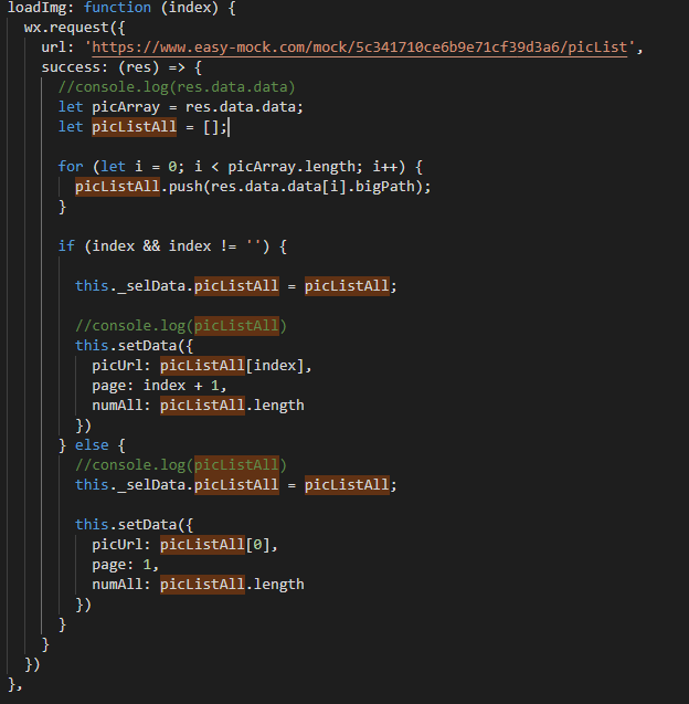 1. 将请求到的数据存入一个数组picListAll内,这里不需要setData,只需要在data外面定义一个变量就行了,以减少渲染性能。