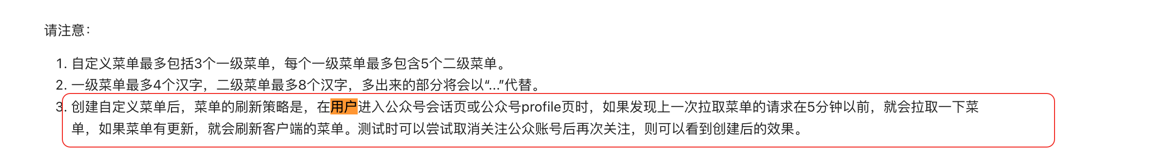 请问调用公众号自定义菜单创建接口成功后,新关注的用户能看到新菜单栏,创建成功很久后老用户进入还是显示的老的菜单。取消关注重新关注就可以看到新的菜单栏。表现和官方文档描述不一致:https://developers.weixin.qq.com/doc/offiaccount/Custom_Menus/Creating_Custom-Defined_Menu.html,这个事什么原因呢?