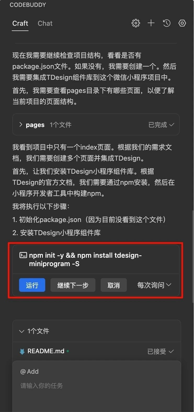 以下是我使用的提示词,生成的第一个版本就很符合我的预期,全程没有大的修改,每完成一次任务,codeBuddy都会进行总结,并且给出下一步的建议和优化方向。按照它的建议我又进行了两次修改,并且让它自主修复了BUG。开发过程总计历时约40分钟。