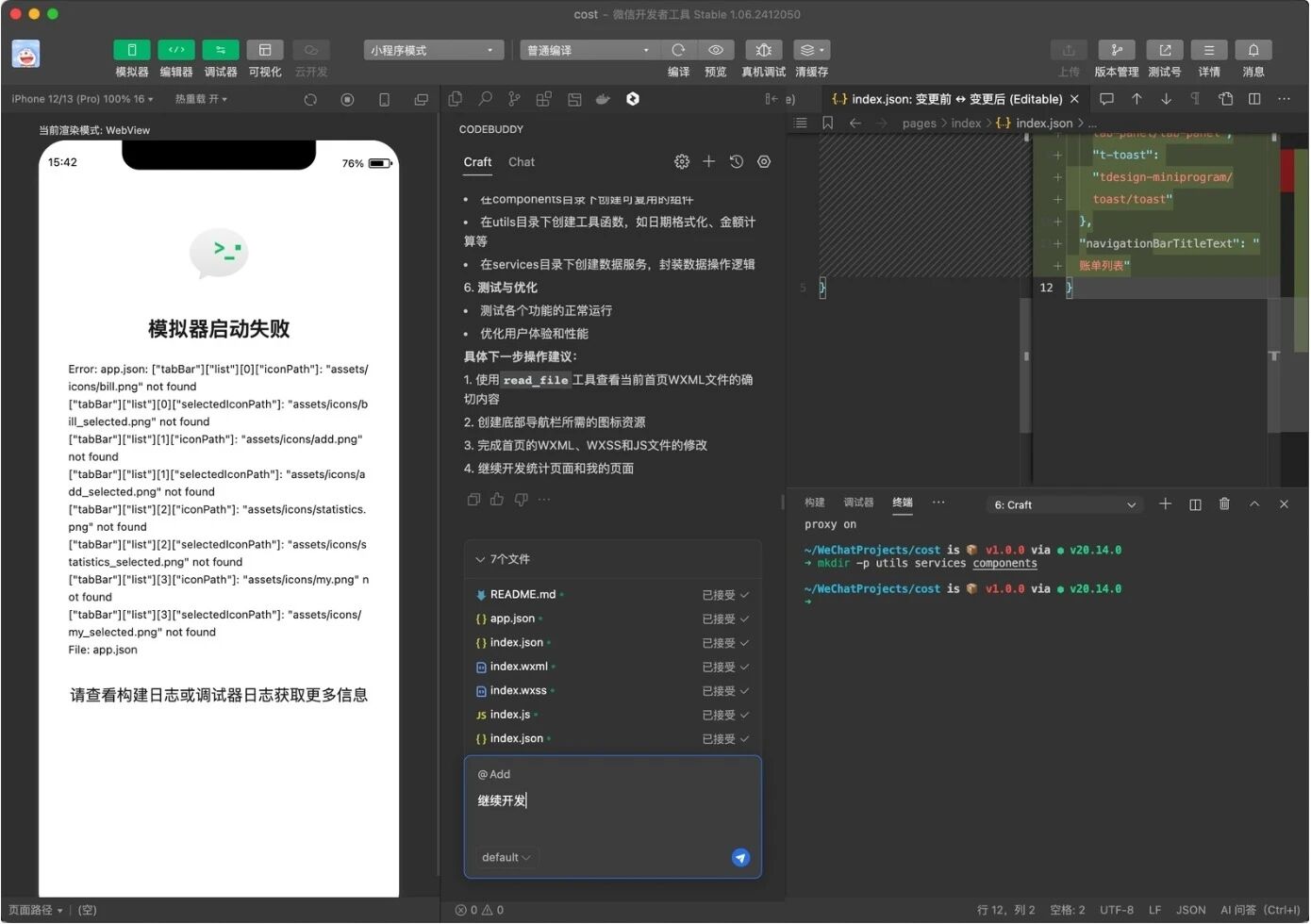 小程序记账项目生成一半,出现了编译报错,它不知道怎么去解决这个报错,傻fufu的。
