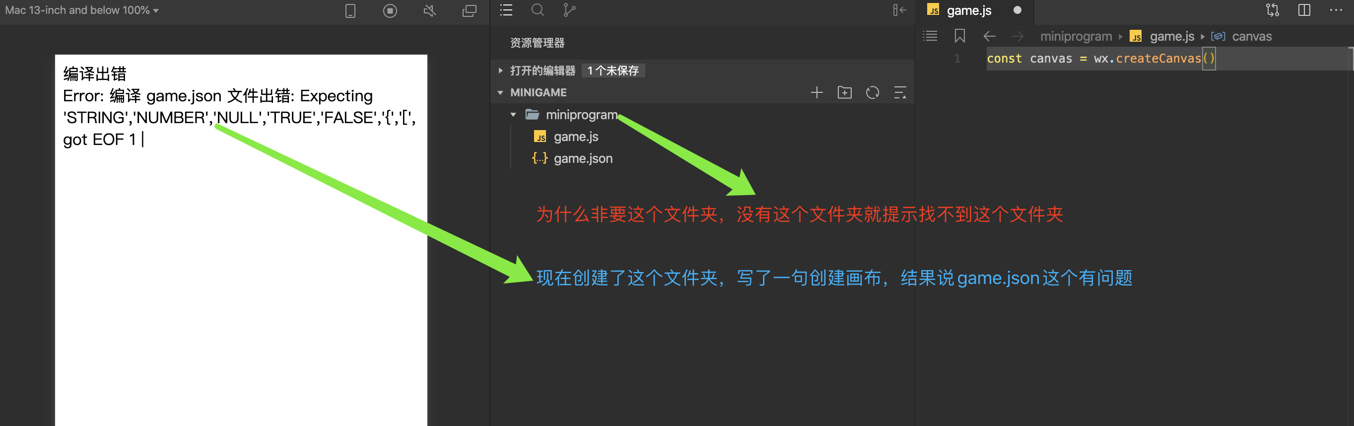 我是小白,根据这个开发工具指南(https://developers.weixin.qq.com/minigame/dev/guide/#%E5%88%9B%E5%BB%BA%E7%94%BB%E5%B8%83)就出现了这些问题,求帮忙,电脑是mac,那个game.json这个是空白,没有任何语句的