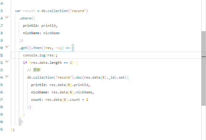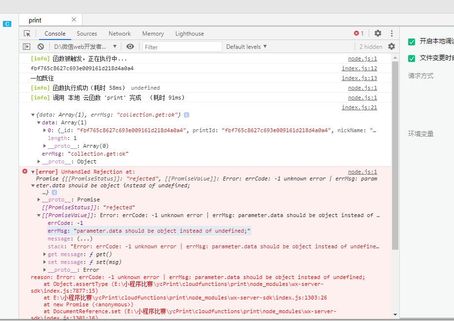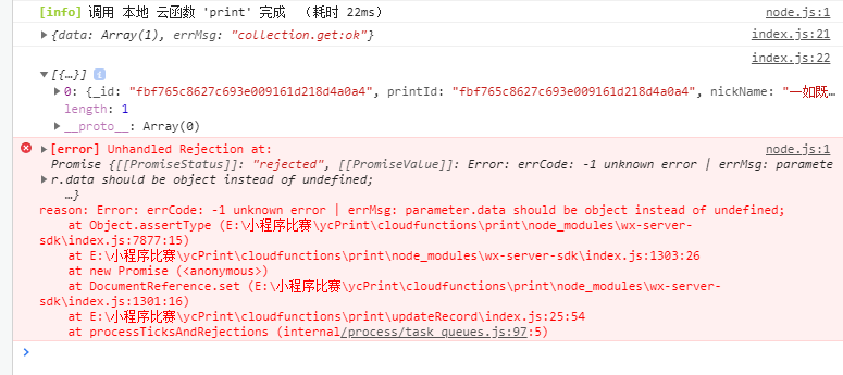 下面是云函数本地调试报错,res结果出来了并且能够将data里面的数据点出来,但是后面再用的话会报这个错