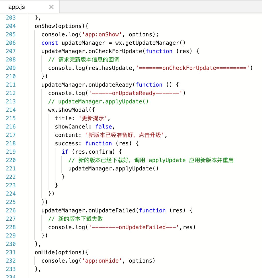 小程序冷启动时如果发现有新版本,将会异步下载新版本的代码包,并同时用客户端本地的包进行启动,即新版本的小程序需要等下一次冷启动才会应用上。 如果需要马上应用最新版本,可以使用 wx.getUpdateManager API 进行处理。